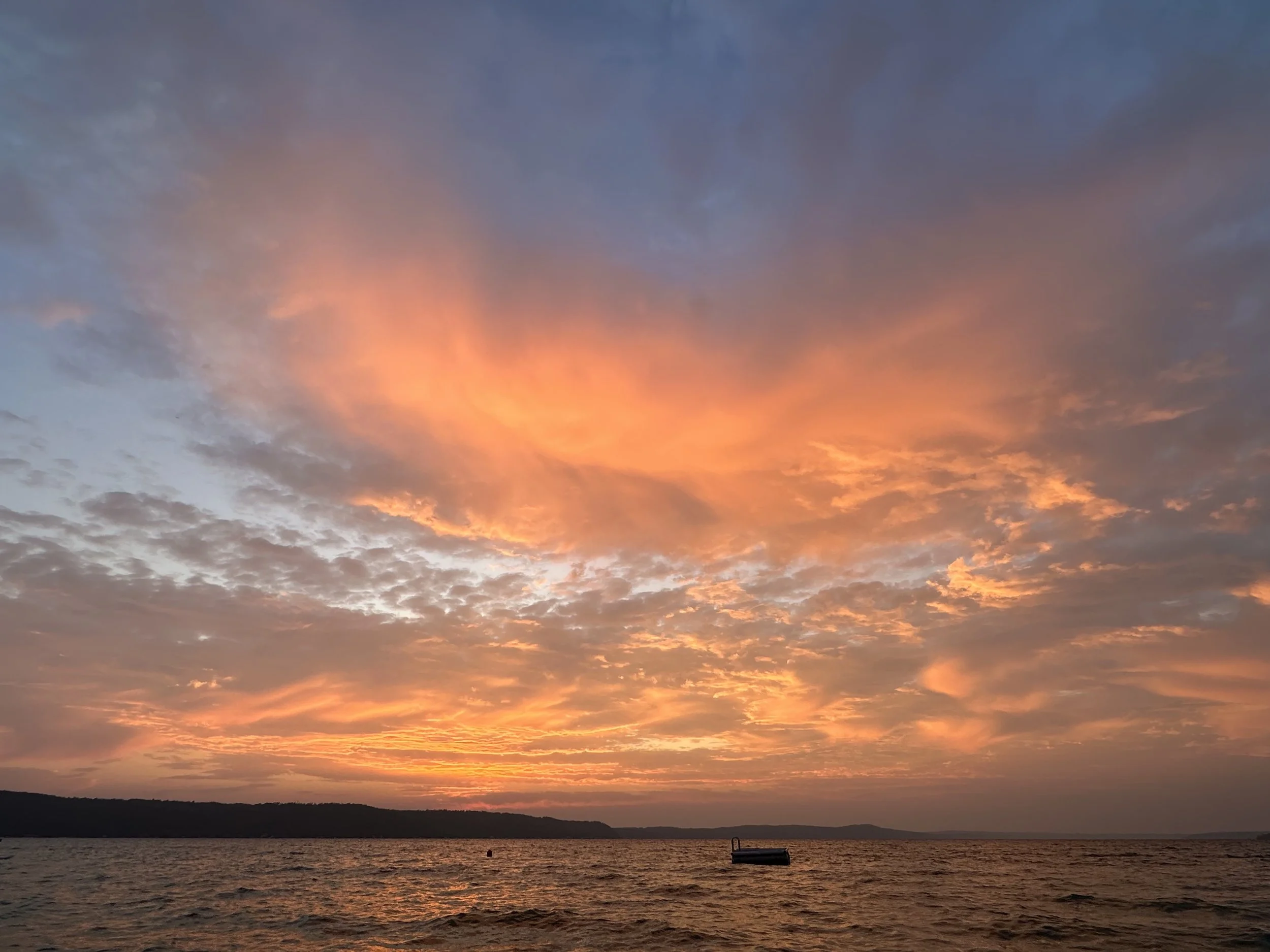 I got up this morning to watch the color play of pink and orange and blue and white and gray in the vast sky as the sun was rising to the east over Crystal Lake, Michigan, where I’m staying for a couple weeks. It was a beautiful sunrise for sure and so unique for me because of rising over a large body of water, which I don’t normally get to see. Not only were there the visual colors of the sky and the drama of the clouds, but I felt a light breeze on my skin, and heard the water with its small waves lapping against the dock and rhythmically crashing into the shore.